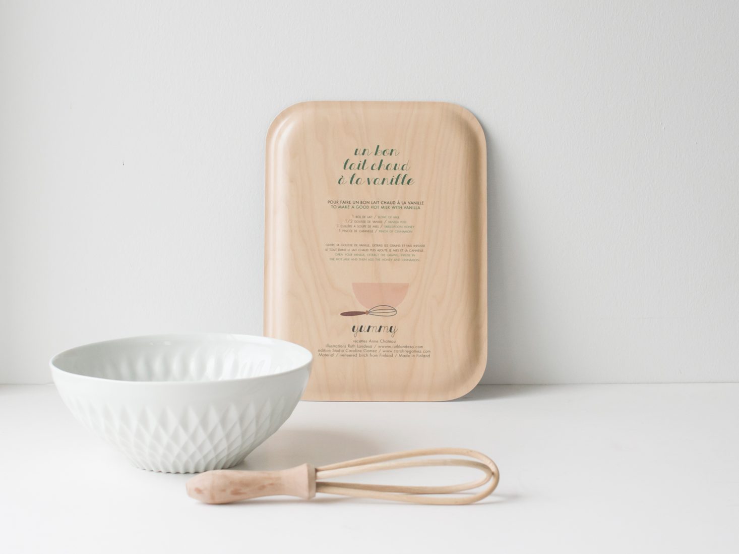 The tray has an illustration in the front side and, in one model , the recipe of “Hot Vanilla Milk ” (in both English and French languages) in the back side.